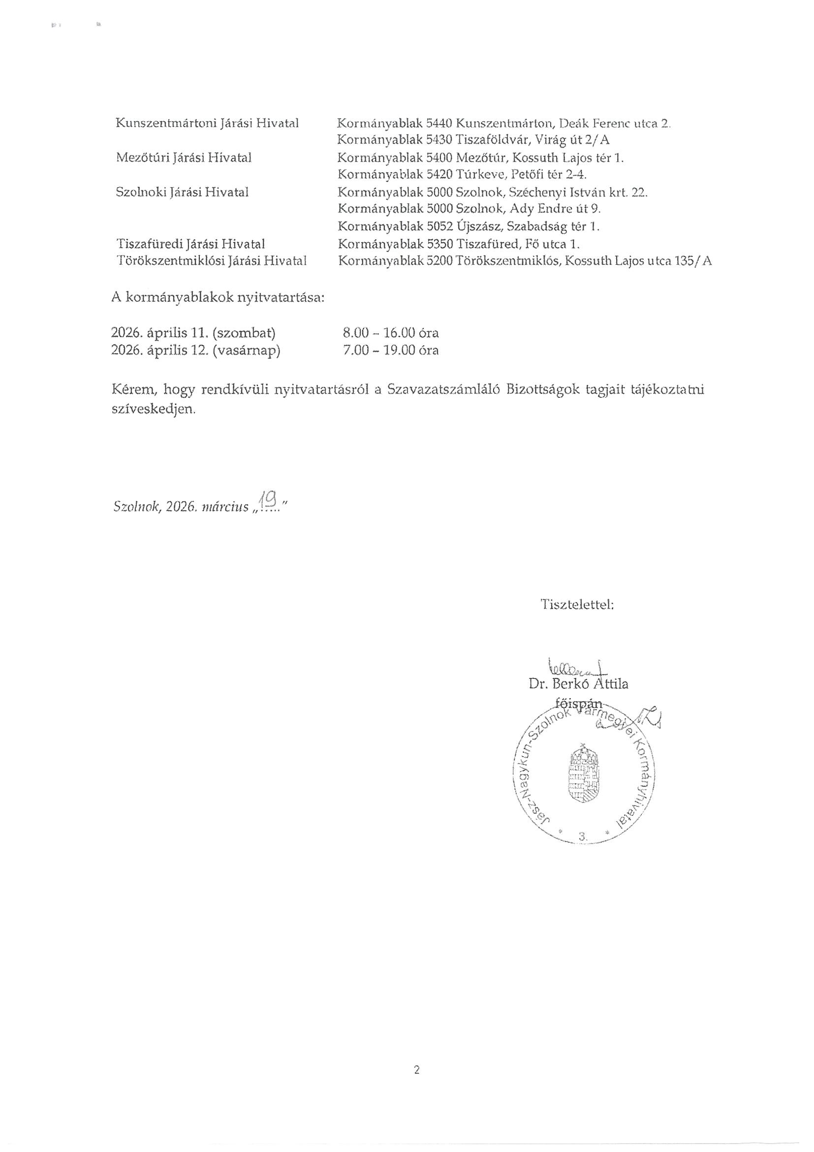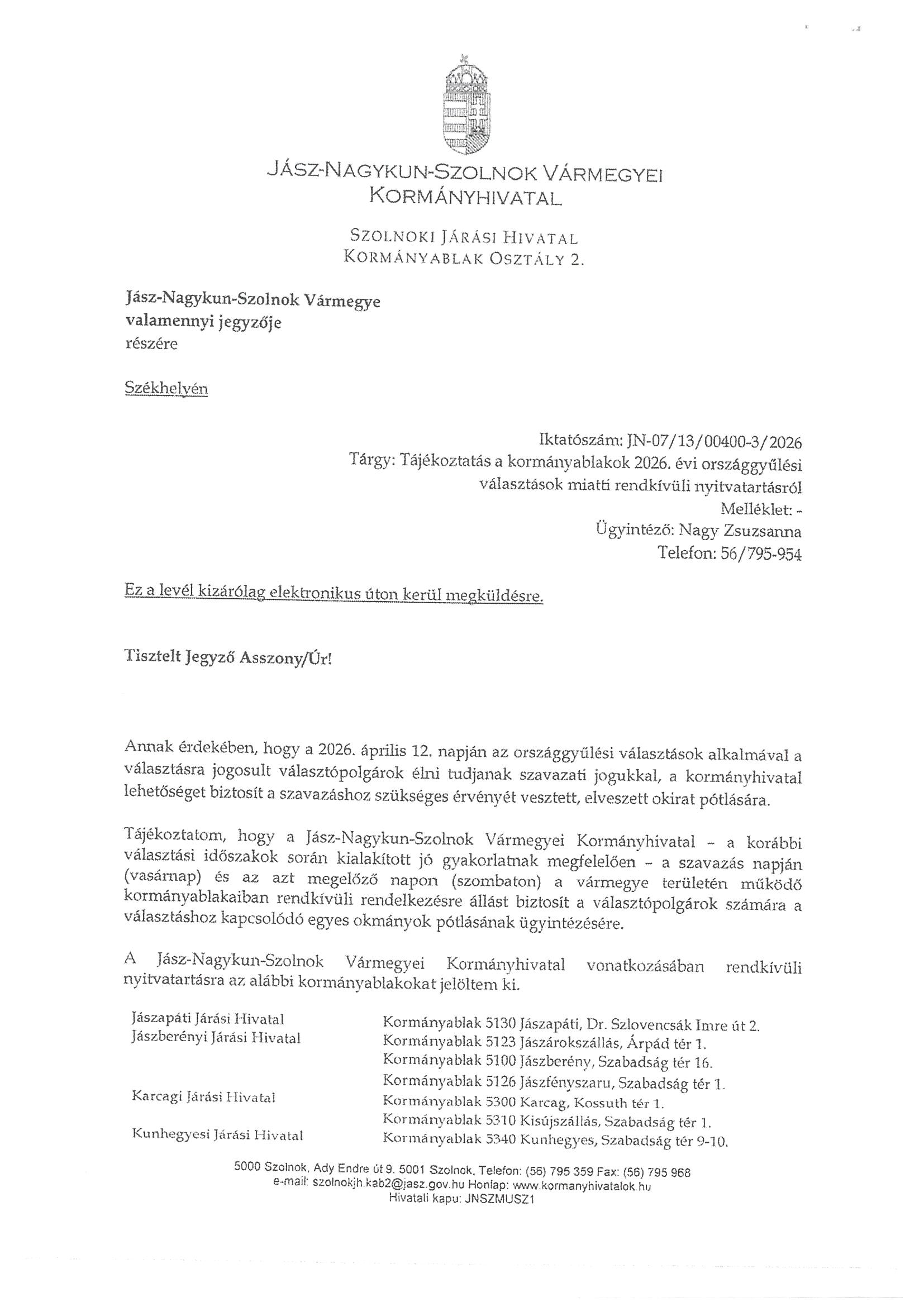 KORMÁNYABLAKOK RENDKÍVÜLI NYITVATARTÁSA A 2026. ÉVI ORSZÁGGYŰLÉSI VÁLASZTOK MIATT!!!